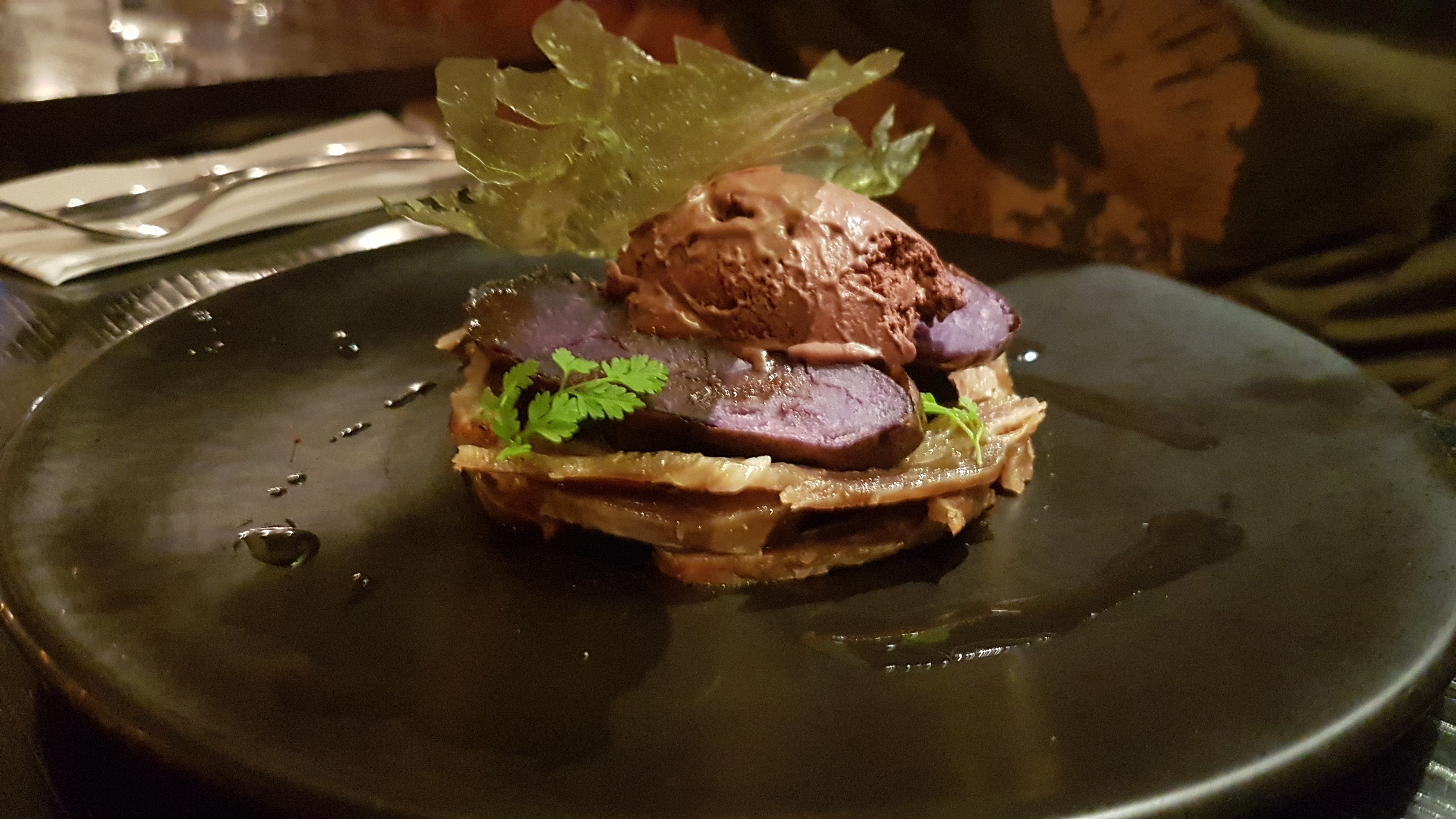 The most ‘out there’ dish though was Daniel’s main course. Lamb bacon, topped with a purple maori potato. On top of that was a scoop of black pudding ice cream, yes you read that correctly, garnished with a rosemary crisp. He described it as wild and out of his comfort zone, but in a really good way.