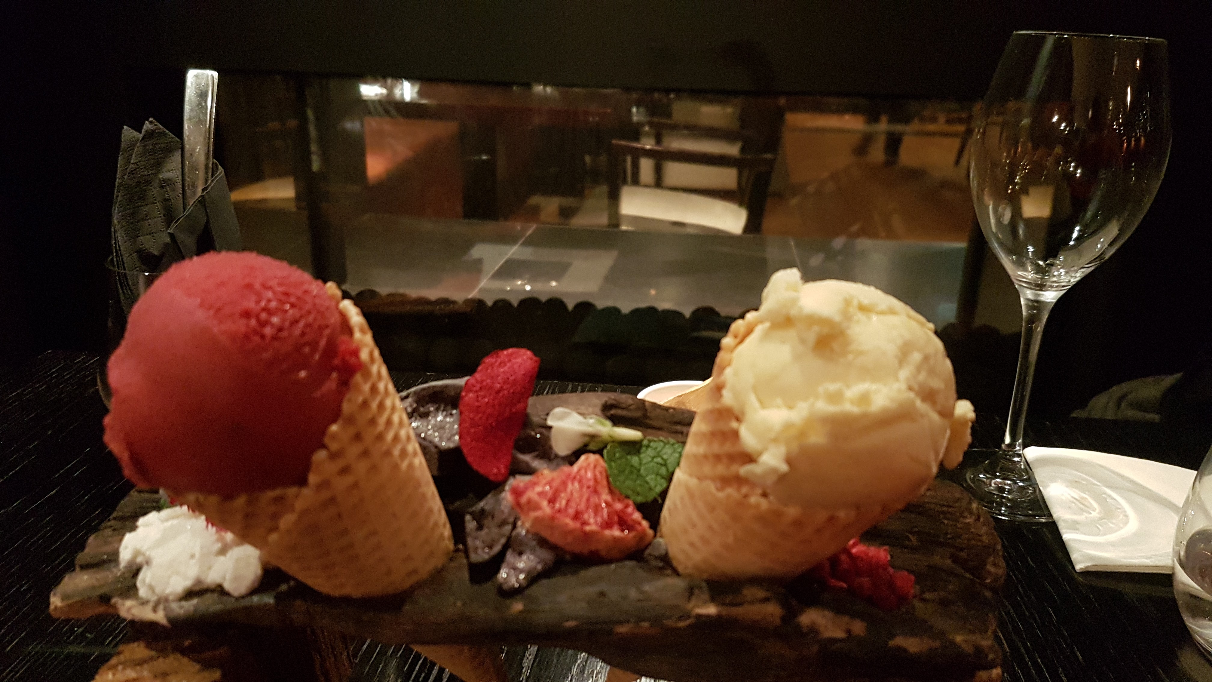 Our waiter then brought out a waffle cone with ice cream (not black pudding flavour), telling us that’s it’s the first dessert! I have never been anywhere before were you are served 2 desserts!