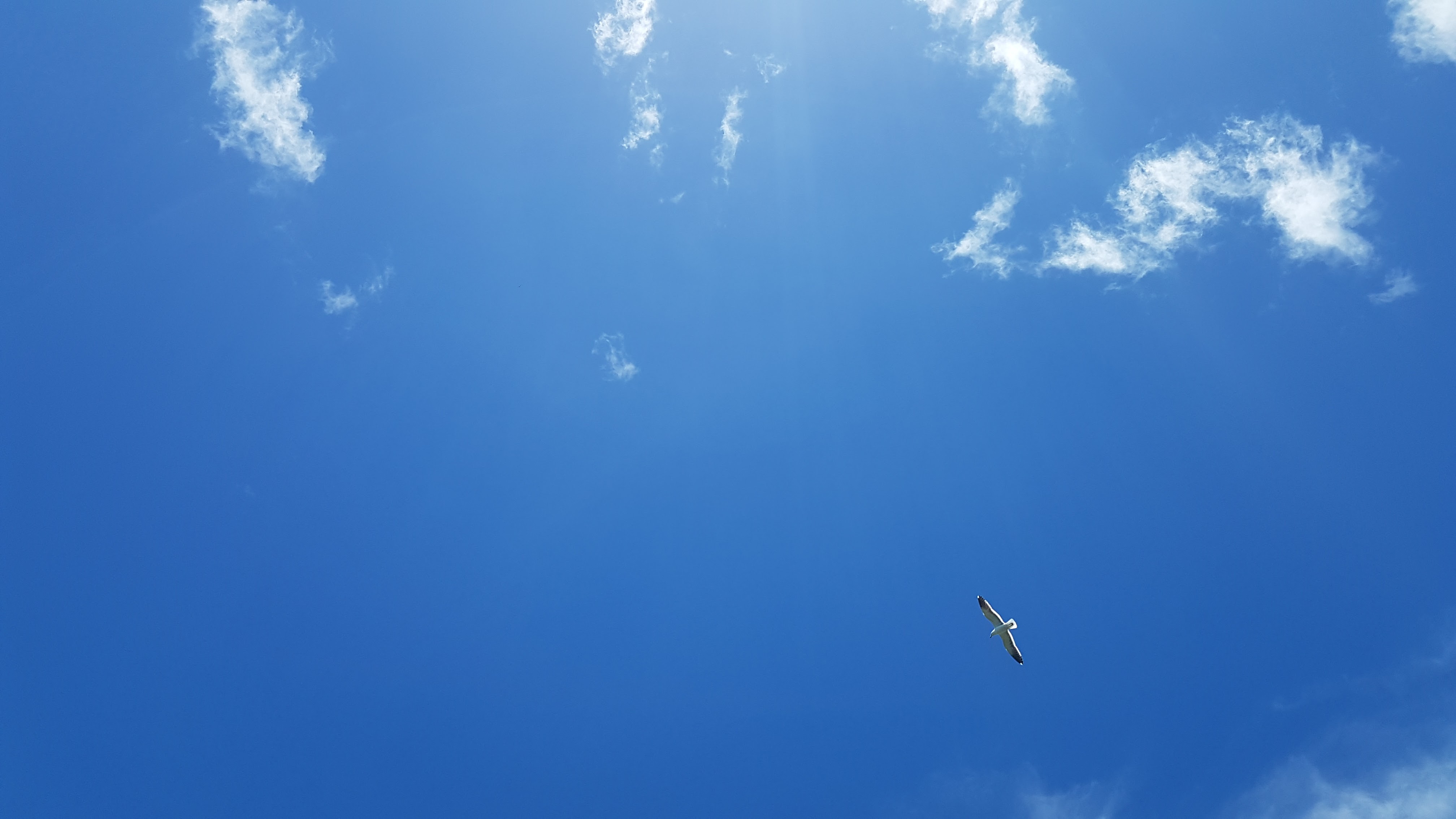 Seagulls are cliff diving against brilliant blue skies. The gentle, lapping sound of the waves moves to the rhythm of my soul. I always find this sound so peaceful.