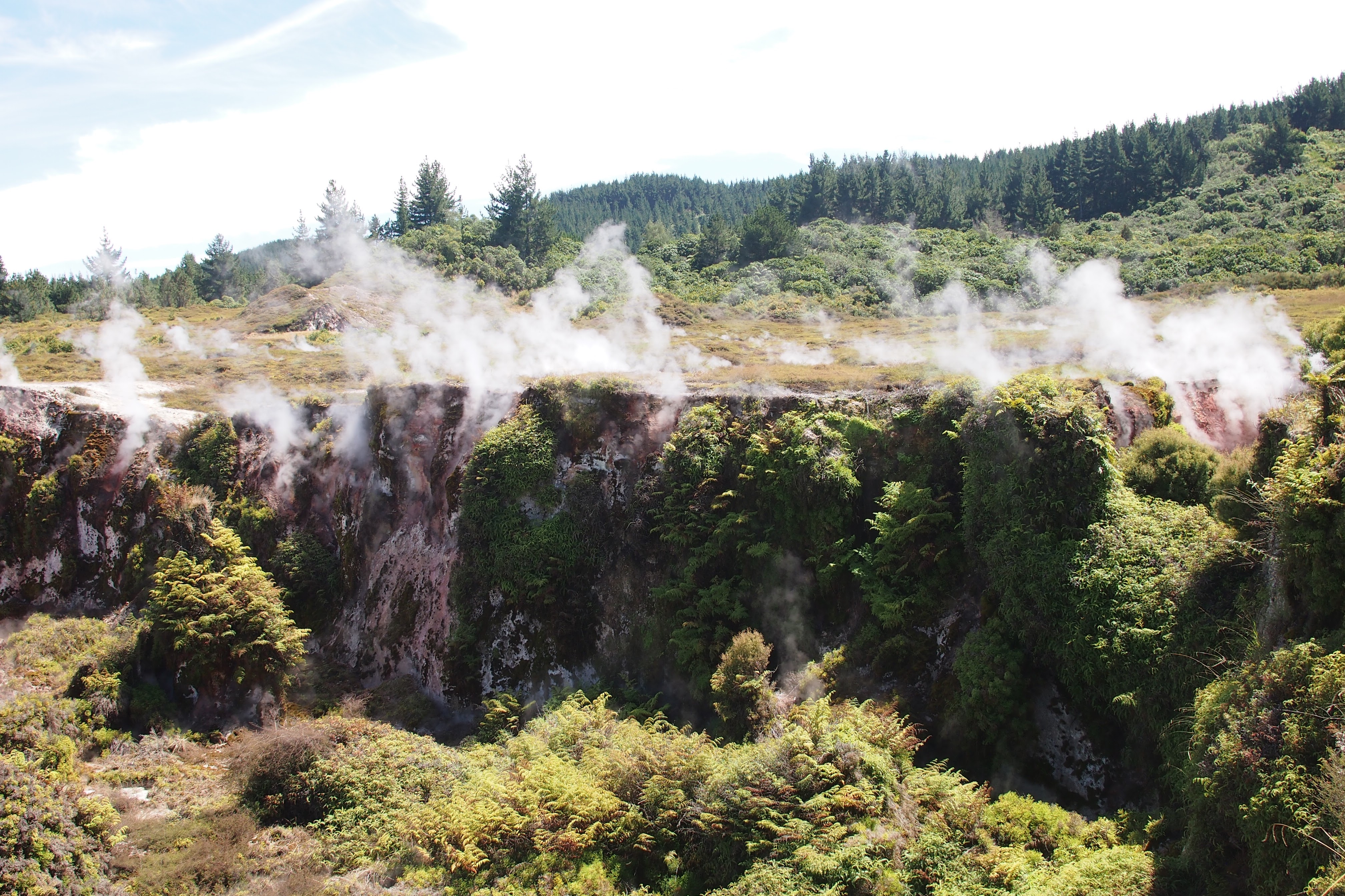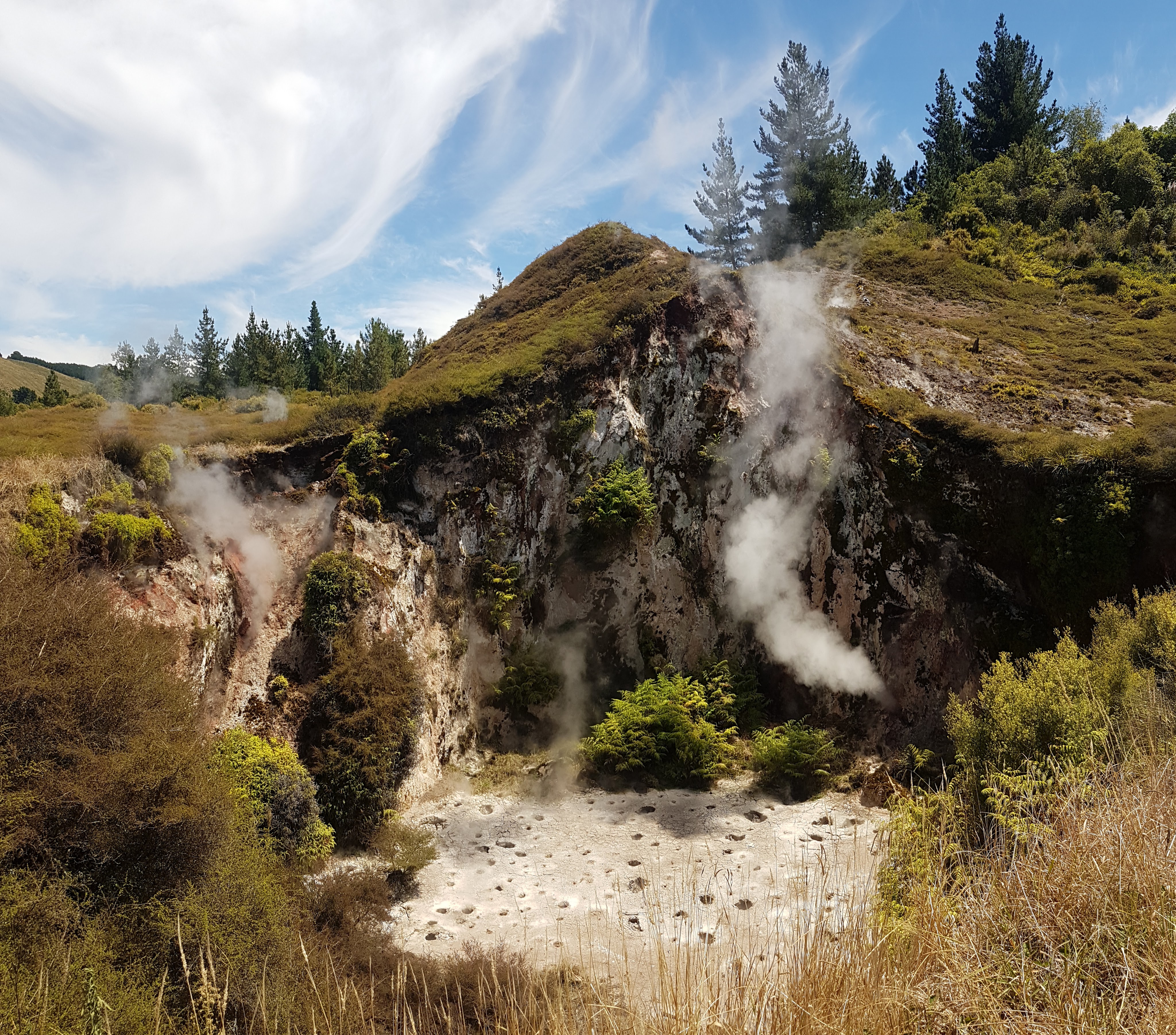 The most impressive was a 3 minute walk up some steep steps to a lookout. There are 2 craters, the first is steaming away but average in size. An information board tells us this used to be the main crater but a landslide buried most of it and a new crater opened to release the pressure and steam. This one is intense. The viewing platform gets quite close to it. It doesn’t take long before I am engulfed in steam. I can feel the intensity of the heat on the back of my legs, my sun glasses steam up and the railing is incredibly hot. This crater was certainly a highlight.