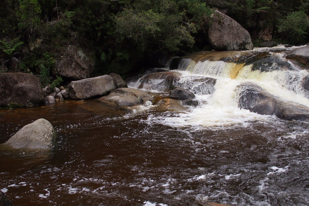 The jump across has got us to the pools, but the water is high and fast flowing, it’s also pretty brown. There is no way we will attempt to slide down those rocks, it wouldn’t be safe. So we take some photos, admire the view and then hop back across the rocks to the track. I take a different route, but again, the last step looks too far for me to jump. I am not risking that again. So it’s off with the shoes and socks and I walk the last part. It’s fast flowing water up to my knees, but it’s only a couple of steps and Daniel is right there to help me.