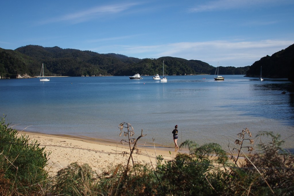 We walk the rest of the track. My leg is a bit sore, but I am managing. I think I will be pretty stiff though once I cool down and my muscles are no longer warm. The track finally leads us out to another beautiful beach. Anchorage Bay. A huge, crescent stretch of golden sand. The sea is green, reflecting the colour of the trees and boats have docked in the quite bay. The water looks so inviting. Again, it is quite a long beach, so we start our walk to the camp. Today’s walk has started and ended on the beach. As we set off, my fitbit buzzes again. 30,000!