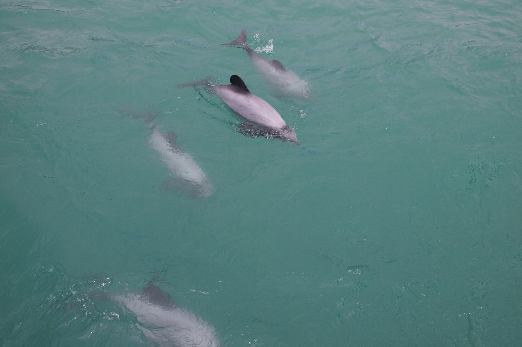 It doesn’t take long before we spot our first dolphin. Their round, black ‘mickey mouse’ fin is very distinctive and their silver bodies flash in the water when near the surface. Hector’s dolphins are the smallest and rarest dolphin in the world. They grow to only 1.5 meters in length and are normally found in pods of 2-5. Our first sighting is a single dolphin that comes right up to the boat. It swims all around the boat giving spectators from all sides a great view. It hangs around for a while so the captain starts moving the boat going forward to see if it wants to play. It does! It zooms through the water at the bow at incredible speed, it has no issues keeping up with the boat. We watch it, darting along, popping up through the water and back under.
