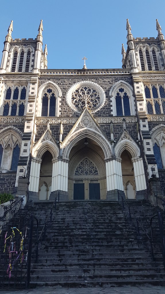 Looking around me, I feel like I am back in Europe. What a stunning building! A grand staircase leads up to the entrance. Tall, white pillars tower up to grand domes and arches, a beautiful example of Gothic architecture. Inside the beauty continues, it is equally impressive with high ceilings and many stained glass windows. There is something very peaceful in the vastness of the high ceilings and open space. I particularly like the window that pays homage to the landscape and nature that is distinct to Dunedin – fur seals, albatross & māhutonga star constellation to name a few.