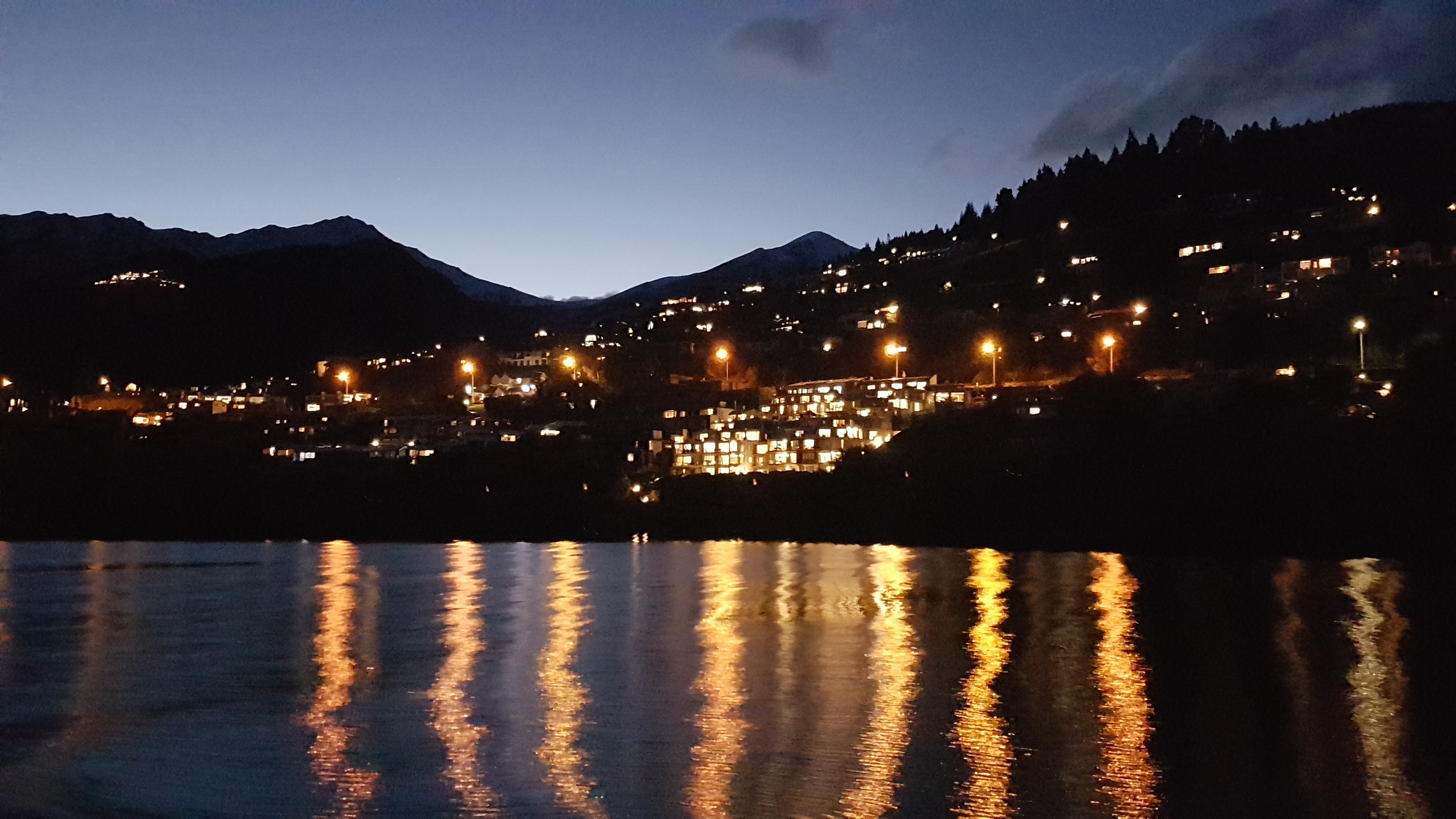 I head out onto the deck to enjoy the view of The Remarkables while I can. Lights are reflecting off the water. It’s dreamy and beautiful.